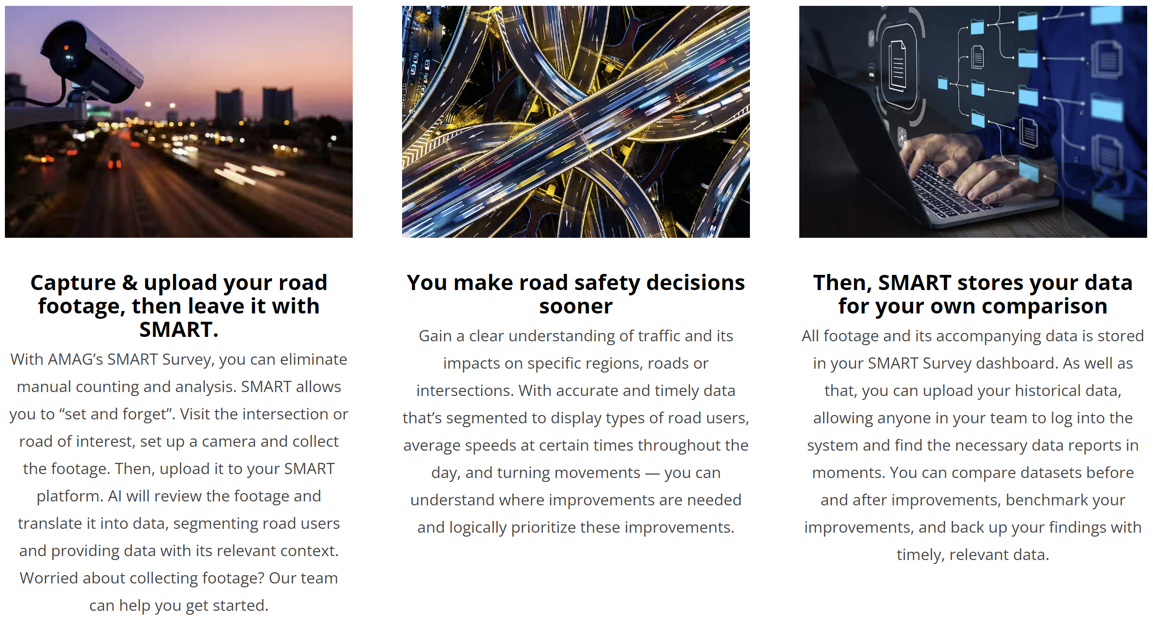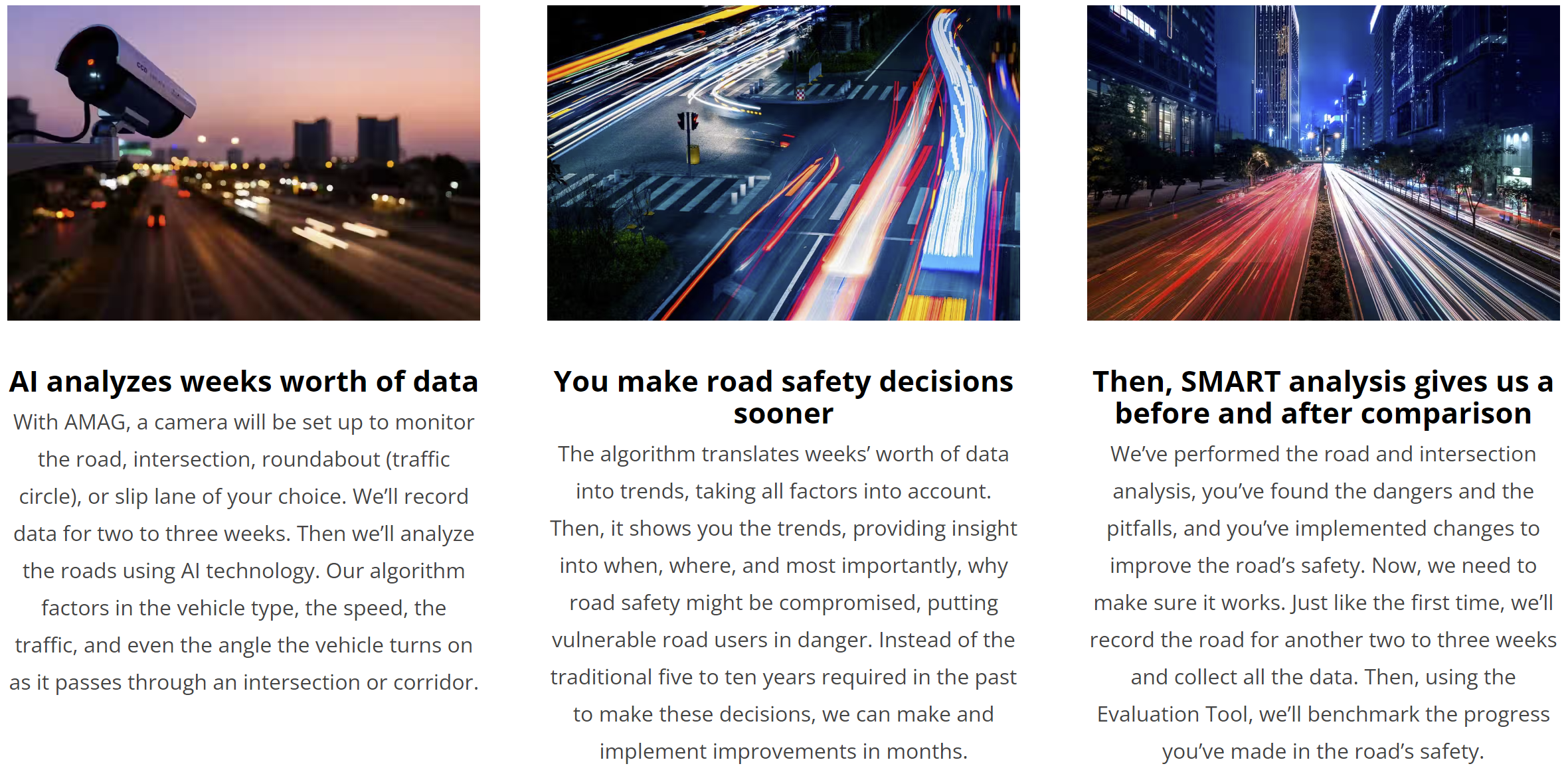 Meet SMART. It’s our Safe Mobility Alert Real Time (SMART) Digital Platform to support Vision Zero and Safe Systems approaches globally. Using video analytics, AI, deep learning, and advanced econometrics, AMAG has developed predictive analytics to boost road safety.