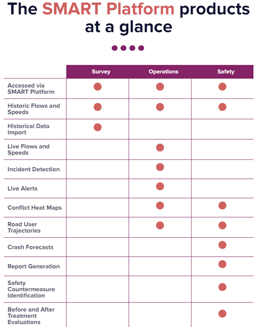 With the SMART Platform, your team and network will enjoy unmatched insights into your road users with never-before-seen efficiencies. Comprising five different platforms rolled into one, SMART Platform allows you to monitor the road in real-time with SMART Operations, collect reliable data fit with insights with SMART Survey, and improve road safety in months, not years with SMART Safety.